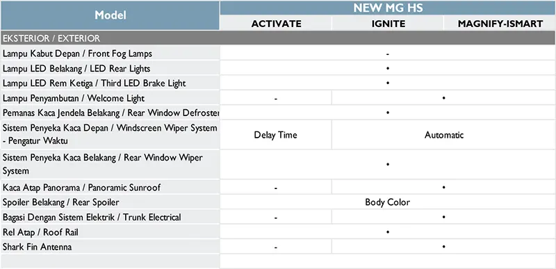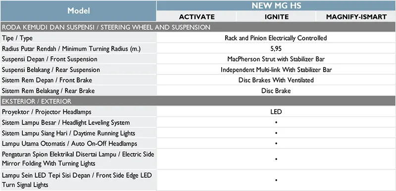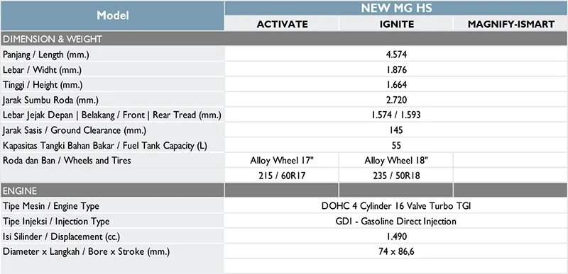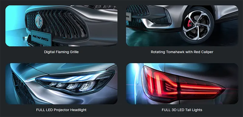 NEW MG HS, SUV canggih yang menggabungkan keseimbangan yang ideal antara kemewahan design dan fitter yang lengkap. 3rd Design Language terkini dari MG menunjukkan garis design CLASSICAL BRITISH yang merupakan karakteristik dari mobil MG. Terdapat juga Digital Flamming Grille & Rotating Toma hawk Alloy Wheels with Red Capiler dengan kesan sporty, dan teknologi terkini melalui FULL LED Projecttor Headlight with Intelligent High-Beam Control.