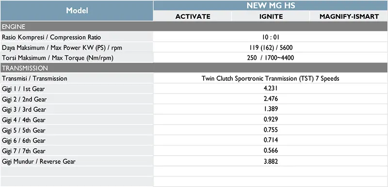 NEW MG HS dilengkapi dengan teknologi distribusi tenaga yang memberikan pengalaman menyetir yang responsive. Mesin turbo yang mengeluarkan tenaga 162 PS di putaran mesin 5600 rpm dengan kombinasi 5 Driving Mode (Eco, Normal, Sport, Super Sport & Custom) yang dapat disesuaikan dengan karakter menyetir dan siap untuk memacu adrenalin Anda. SUV mewah nan canggih yang menggabungkan sistem keamanan airbag 6 titik yang terdiri dari dua airbag depan, airbag samping dan airbag tirai jendela dan didukung oleh sistem perlindungan tersinkronisasi yang memenuhi standar keamanan Eropa, membuat Anda semakin nyaman dan aman dalam berkendara.