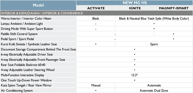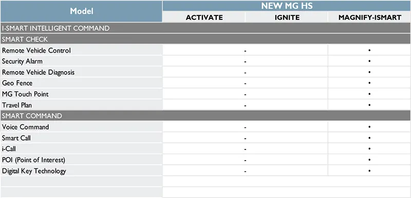 i-SMART merupakan teknologi pintar dari MG yang menghubungkan Anda dengan mobil MG. Teknologi ini akan meningkatkan pengalaman berkendara yang prima, memantau kondisi mobil dengan mudah, serta dapat mengaktifkan fitur-fitur mobil sesuai dengan gaya hidup Anda. Teknologi Artificial Intelligence (AI) dapat terhubung melalui kontrol suara, layar sentuh dan aplikasi MG i-SMART yang membuat kehidupan menjadi lebih mudah. Dengan kemampuan untuk meningkatkan fungsinya secara online, teknologi AI secara cerdas dapat menganalisis perintah Anda. i-SMART adalah solusi ideal untuk gaya hidup modern yang selalu terhubung.