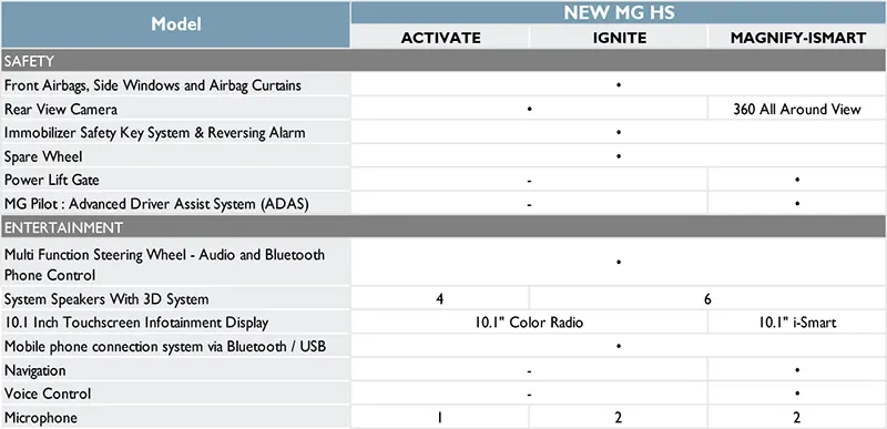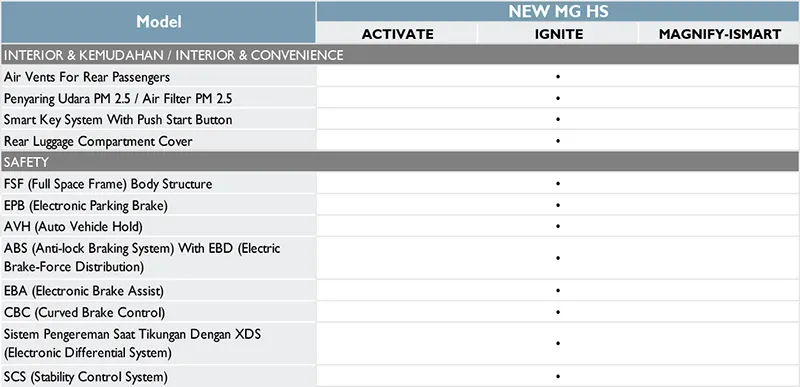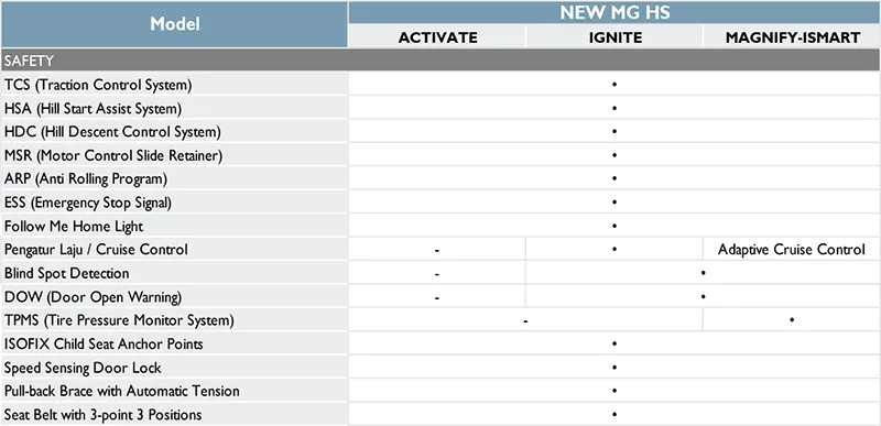 Melangkah lebih jauh dan berkendara ke setiap tujuan dengan percaya diri. MG HS BARU dengan EURO TUNING SUSPENSION dan ADVANCED SYNCHRONIZED PROTECTION SYSTEM, sistem keselamatan yang disempurnakan yang memenuhi standar Eropa, memiliki 25 tur keselamatan yang bekerja bersama untuk memberikan Anda keamanan maksimum